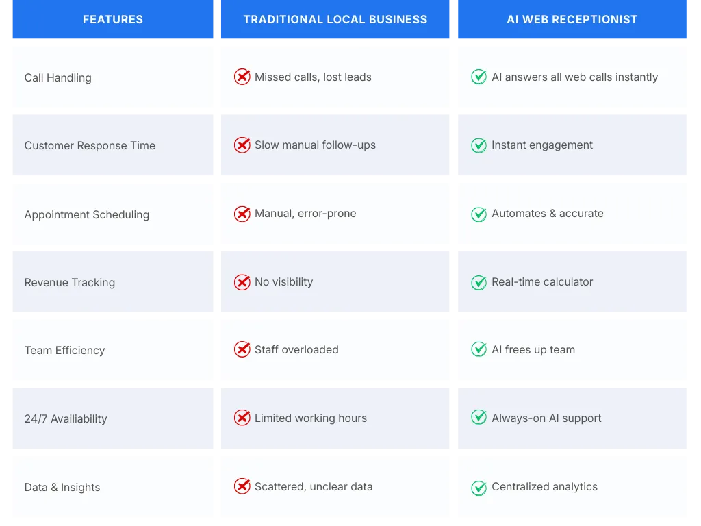 Experience a live AI receptionist that answers web calls, schedules appointments, reduces missed leads,